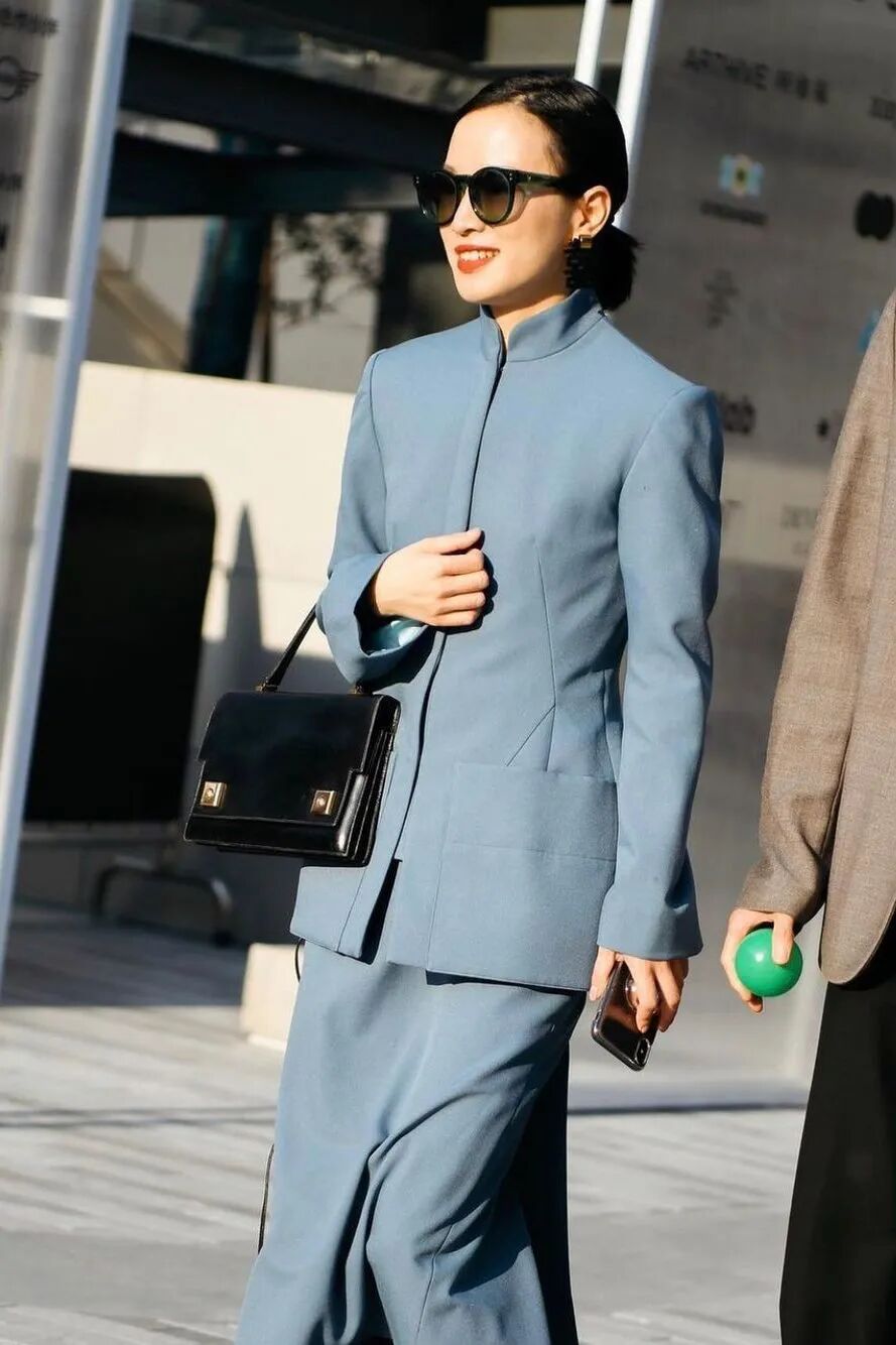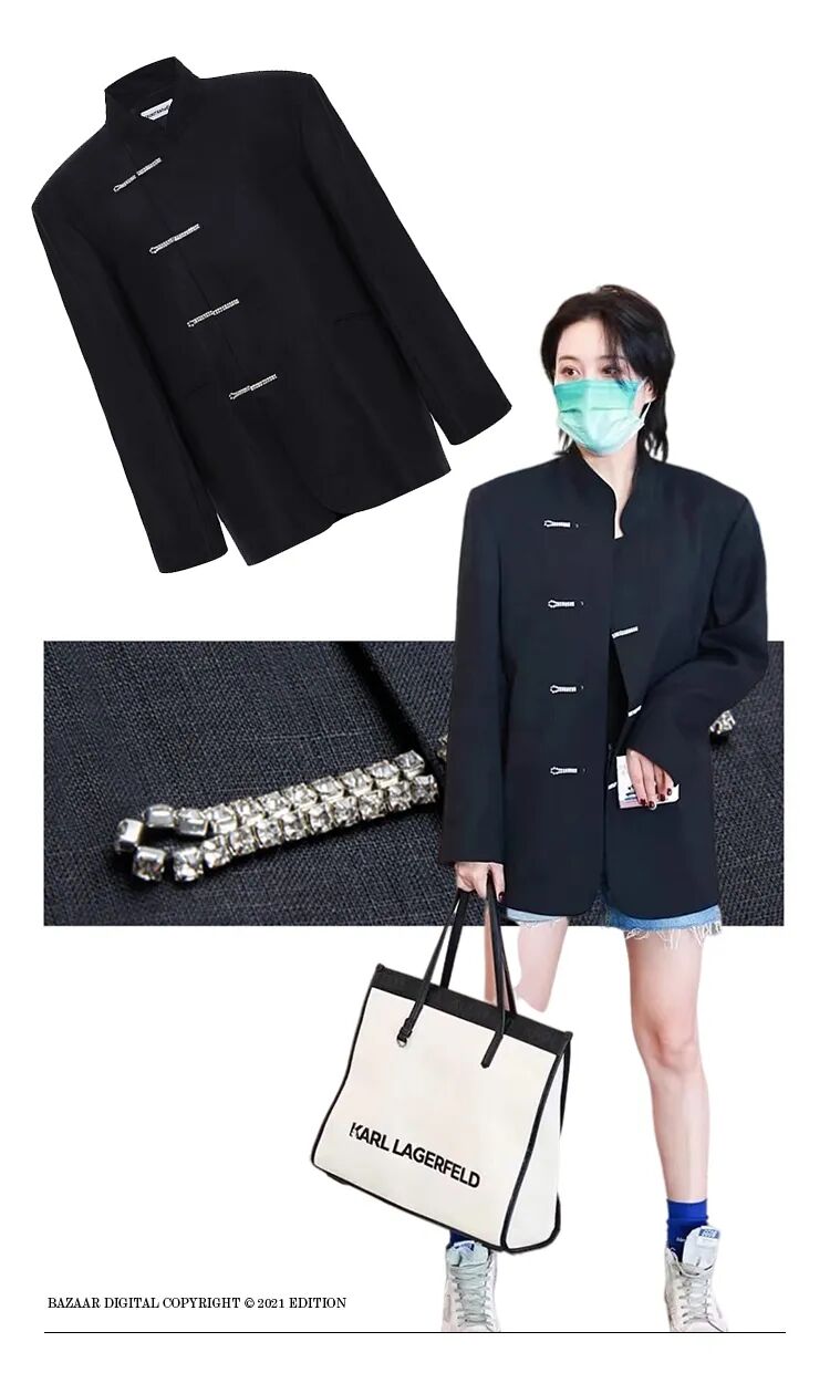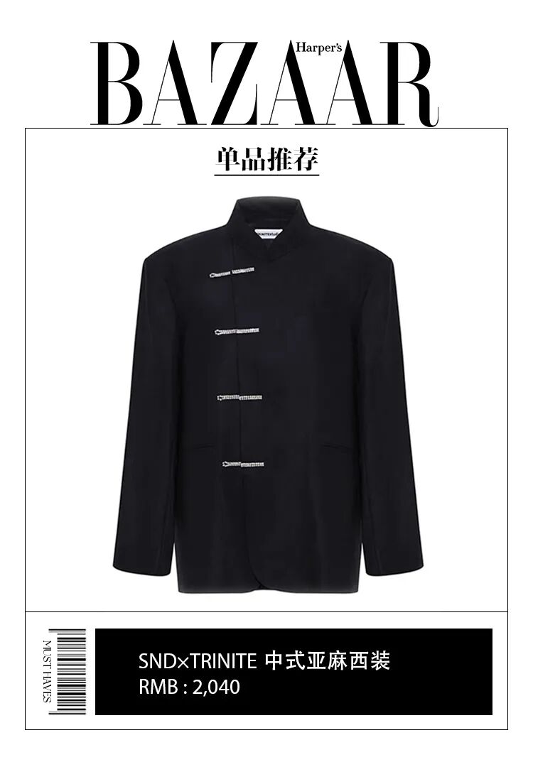 张馨予穿的这件买手店SND和TRINITE联名的中式西装,则更加日常。Oversized的板型是绝对的百搭款式,小立领的设计保留了中式风格,而水晶装饰扣也让唐装看起来更加年轻。